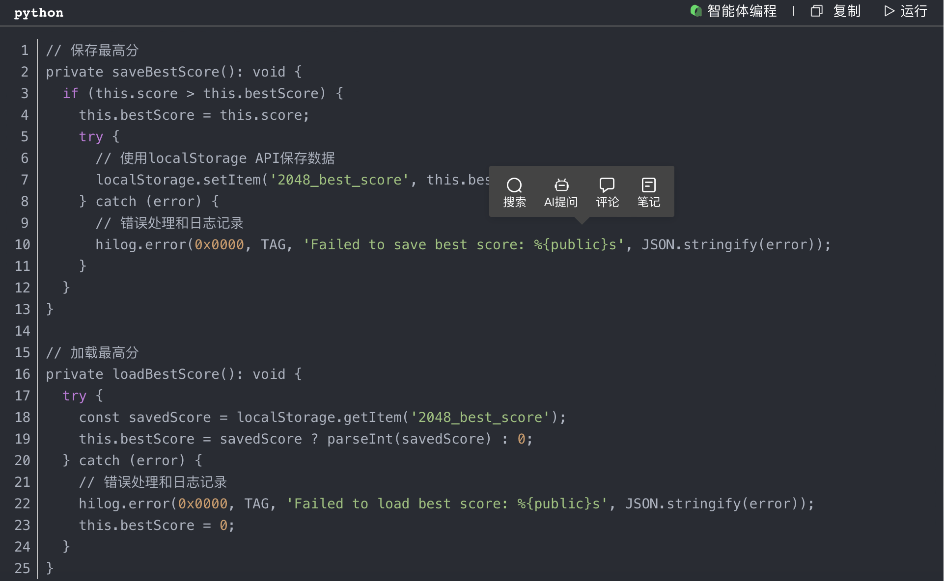 为了保存用户的最高分记录,我使用了HarmonyOS的本地存储API。这样即使用户关闭应用后再次打开,也能看到历史最高分。