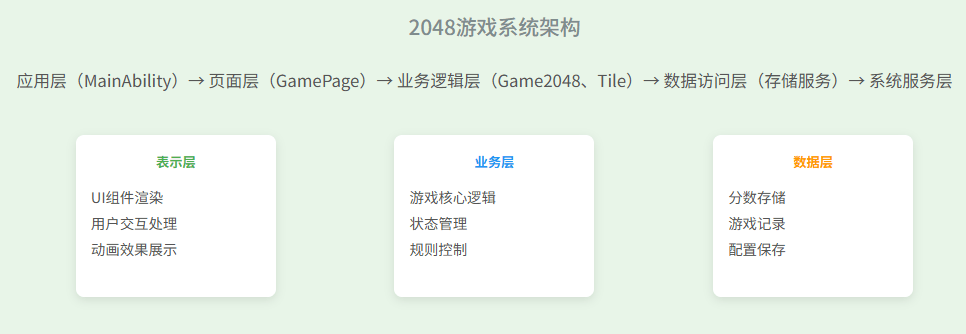 应用层(MainAbility)→ 页面层(GamePage)→ 游戏逻辑层(Game2048、Tile)→ 系统服务层(存储、事件等)