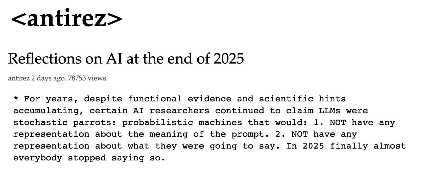 从“随机鹦鹉”到现实: 多年以来,尽管功能证据和科学线索不断积累,某些 AI 研究人员仍坚称大语言模型(LLM)只是“随机鹦鹉”:即一种仅凭概率运作的机器,它们:1. 对提示词(Prompt)的含义没有任何表征。2. 对自己将要说的话没有任何表征。直到 2025 年,几乎所有人终于都不再这么说了。