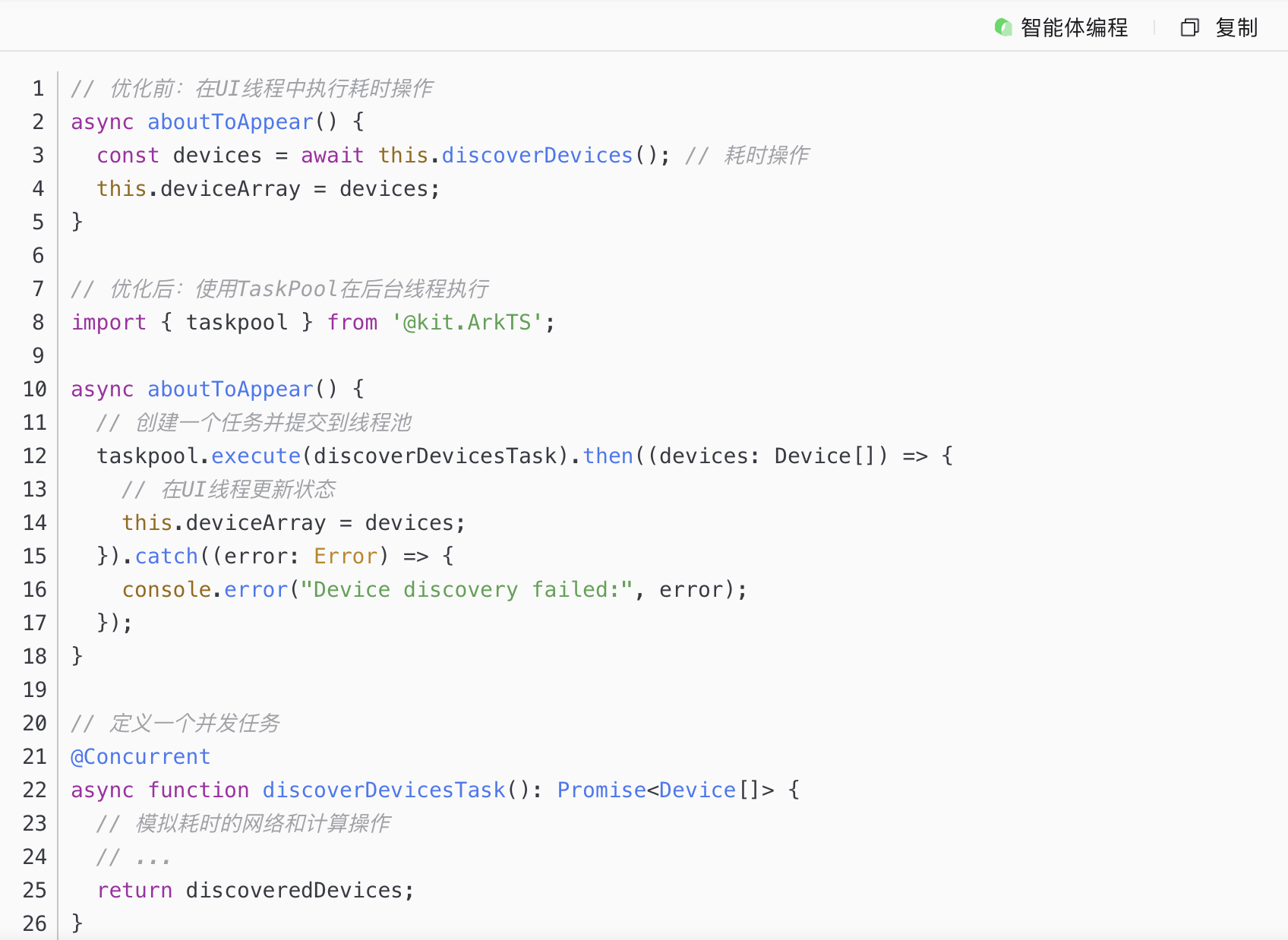 · 优化方案: 我们将设备发现的网络请求和数据处理逻辑全部移到了一个TaskPool(鸿蒙的线程池)中执行,避免阻塞UI线程。