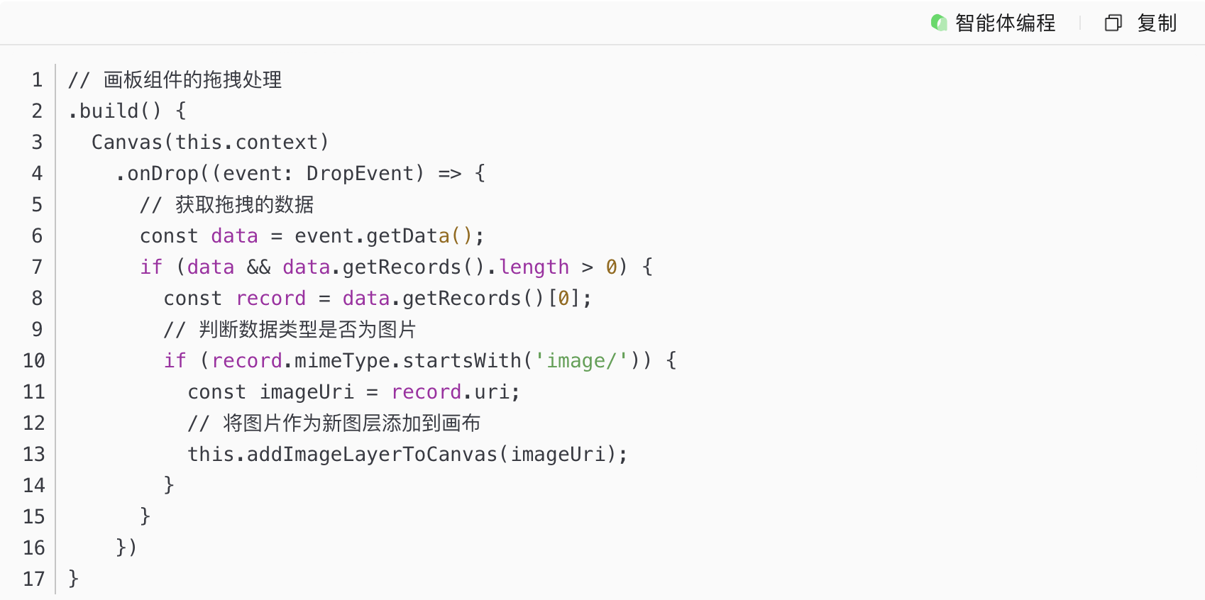 · 技术实现: 我们的画板组件实现了onDrop事件。当用户从外部应用拖拽内容进入画板区域时,系统会调用这个回调。