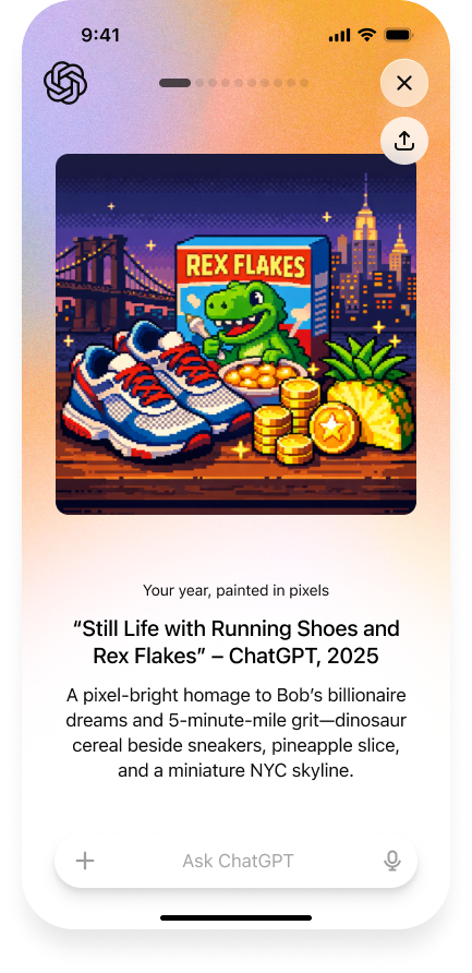 在产品呈现方式上,“Your Year with ChatGPT” 将在 ChatGPT 应用首页以入口形式进行推广,但不会自动弹出或强制用户查看。 用户可在网页版、iOS 版与 Android 版 ChatGPT 客户端中使用该功能,也可以直接在对话框中输入指令,向 ChatGPT 请求启动“Your Year with ChatGPT” 来触发这一年度回顾体验。