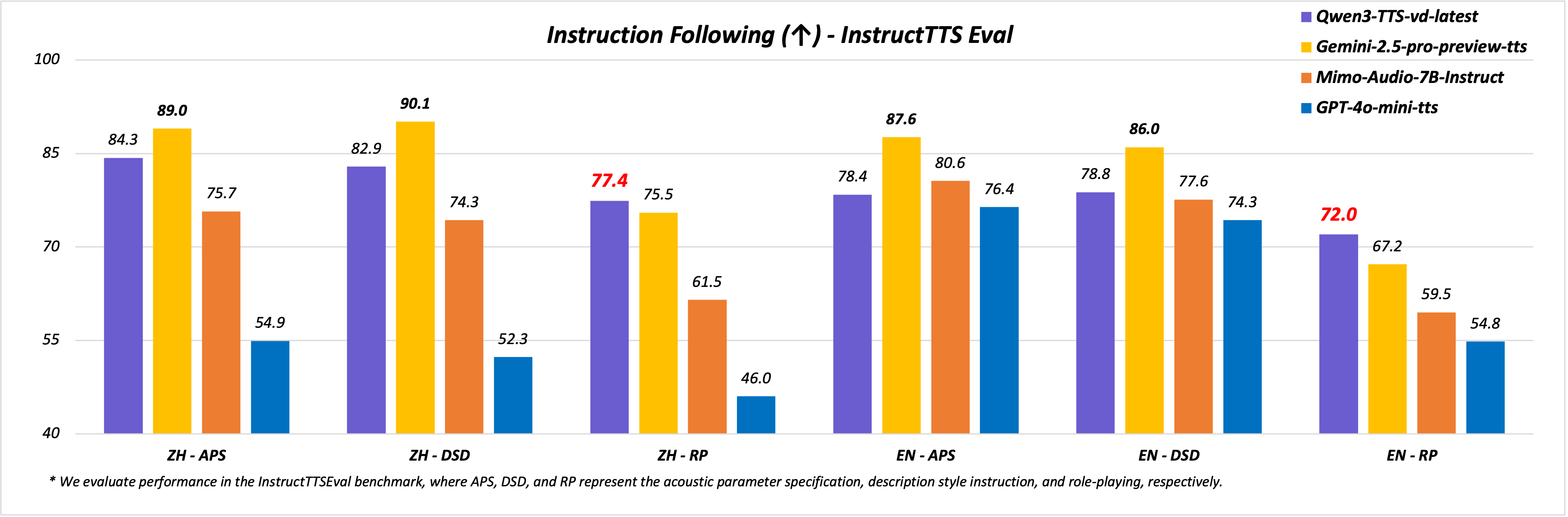 音色创造:Qwen3-TTS-VD-Flash 支持复杂自然语言指令输入,实现对音色、韵律、情感、人设等的精细化调控,实现从“说什么”到“如何说”的全面掌控,可以让用户自由的定义想要的音色,彻底摆脱只能进行根据已有的音色进行克隆或者只能选择固定的一部分预设音色。在 InstructTTS-Eval 中综合表现显著优于 GPT-4o-mini-tts、Mimo-audio-7b-instruct,在角色扮演测试中也超越 Gemini-2.5-pro-preview-tts。