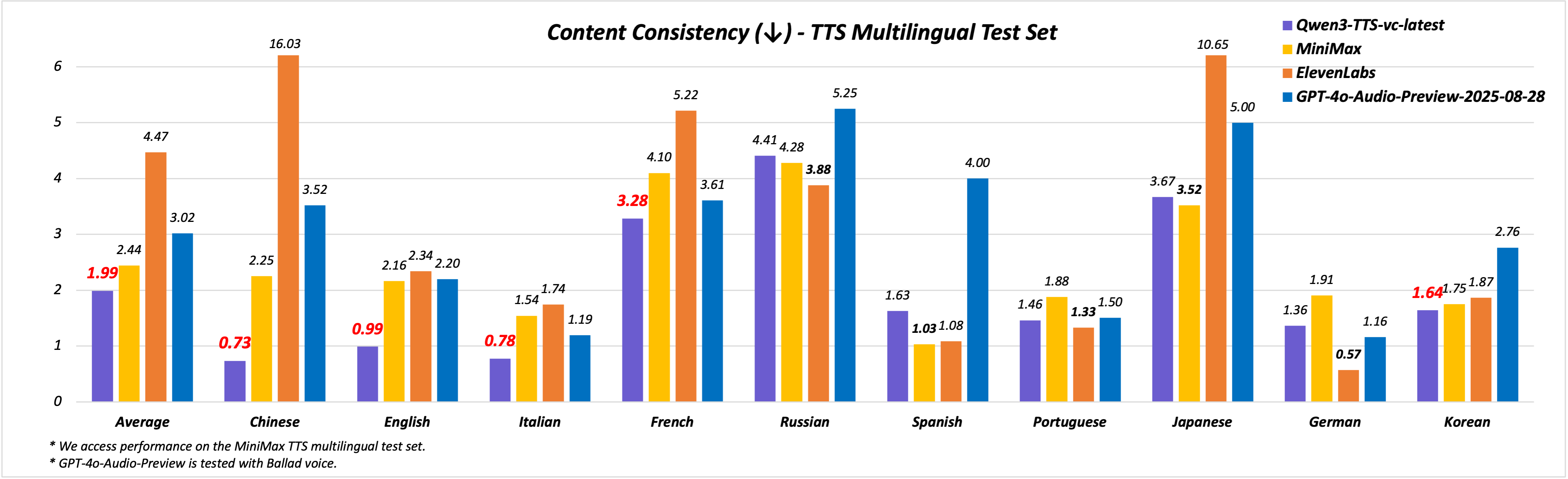 音色克隆:Qwen3-TTS-VC-Flash 支持3s级别音色克隆,并且可以基于克隆的音色生成中文、英文、德语、意大利语、葡萄牙语、西班牙语、日语、韩语、法语、俄语等10大主流语言。在MiniMax TTS Multilingual Test Set上,平均词错误率(WER)全面优于MiniMax、ElevenLabs及GPT-4o-Audio-Preview。