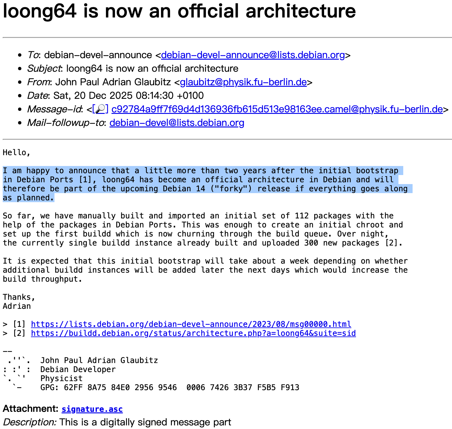 Debian 14 “Forky” 计划在 2027 年发布,届时包含对龙芯的官方支持,这包括整个 Debian 软件仓库对该架构的构建和打包支持。