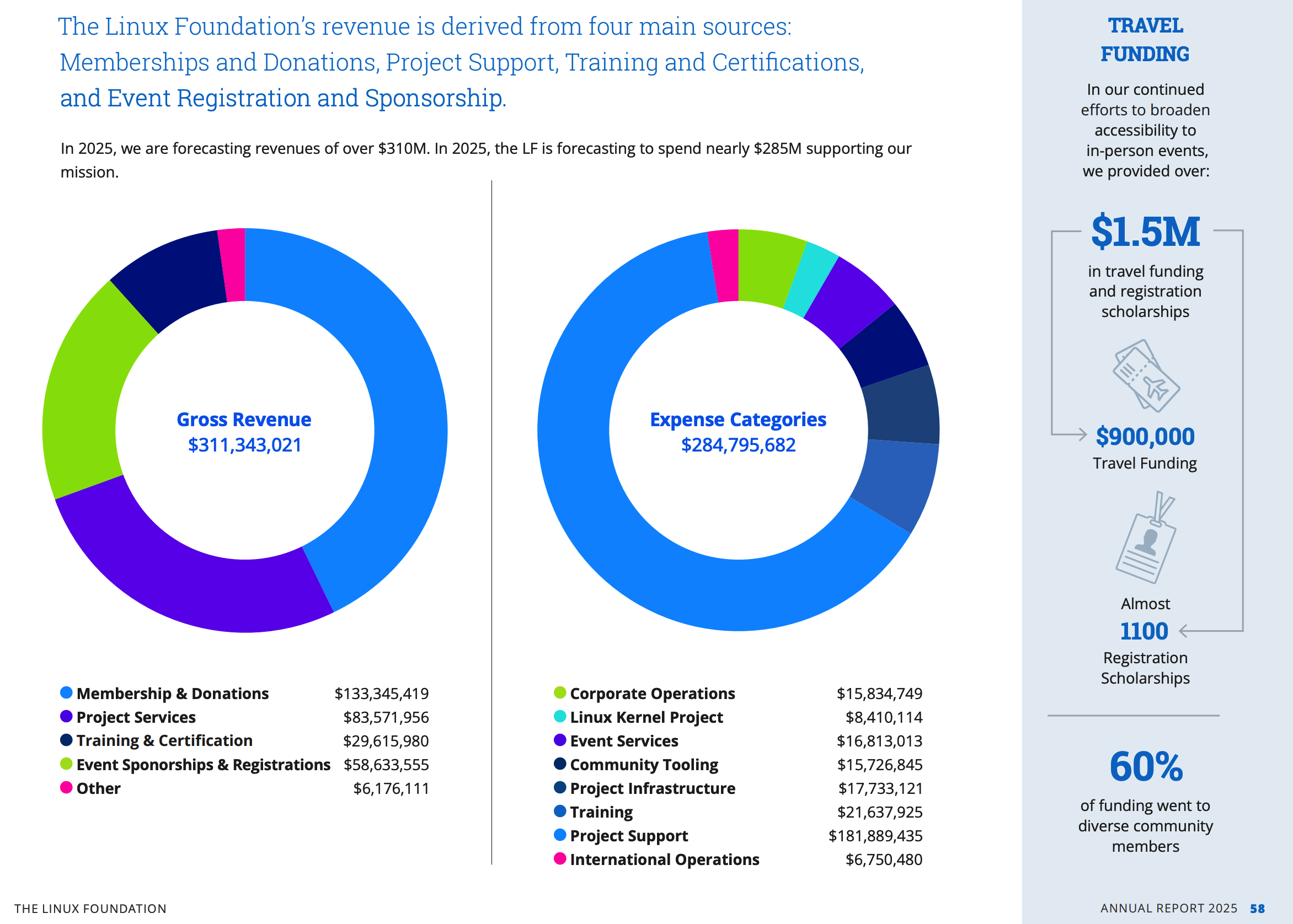 根据报告,Linux基金会预计2025年收入将突破3.1亿美元:全年总收入预计达311,343,021美元,其中会员会费与捐赠贡献1.33亿美元,项目服务收入8300万美元,培训认证课程收入2900万美元,活动赞助及注册收入5800万美元。