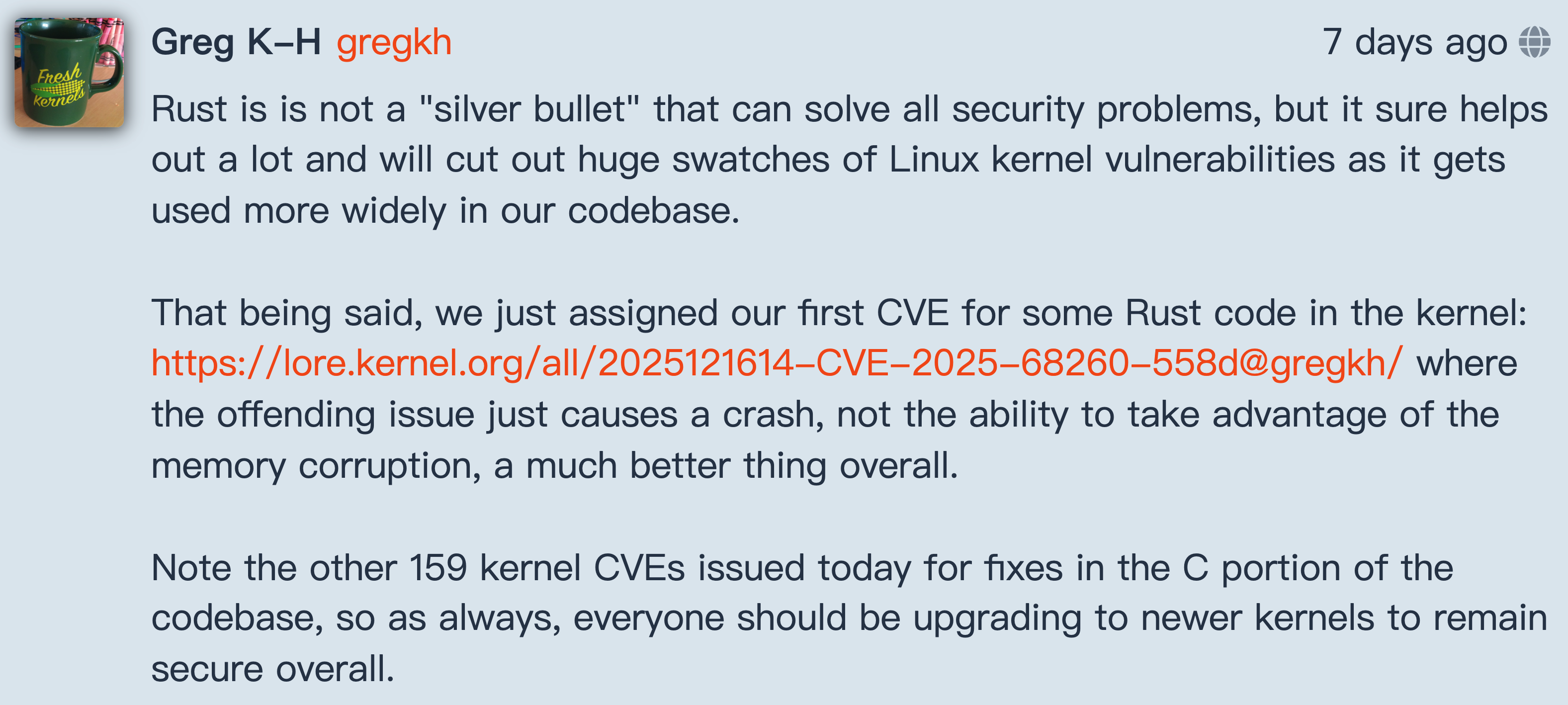 话虽如此,我们刚刚为内核中的一些Rust代码分配了首个CVE:https://lore.kernel.org/all/2025121614-CVE-2025-68260-558d@gregkh/,其中引发问题的漏洞仅会导致崩溃,而不是利用内存损坏的能力,总体来说要好得多。