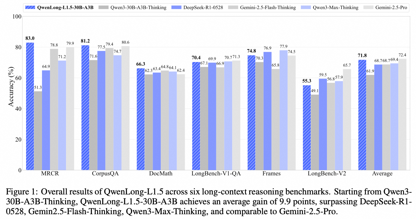 阿里巴巴通义Qwen团队发布了最新的开源 QwenLong-L1.5 模型 ,主打超长上下文推理和记忆管理能力,构建于 Qwen3-30B-A3B-Thinking 模型之上,并增强记忆机制以处理超出其物理上下文窗口(256K)的任务。