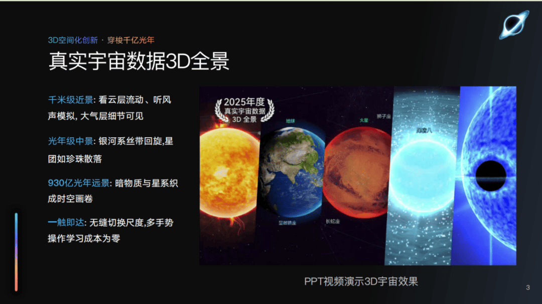 技术创新维度:调用鸿蒙 3D 图形创新能力,实现从地球云层到 930 亿光年外星系的 PBP 无缝缩放渲染,带来极致视觉体验。