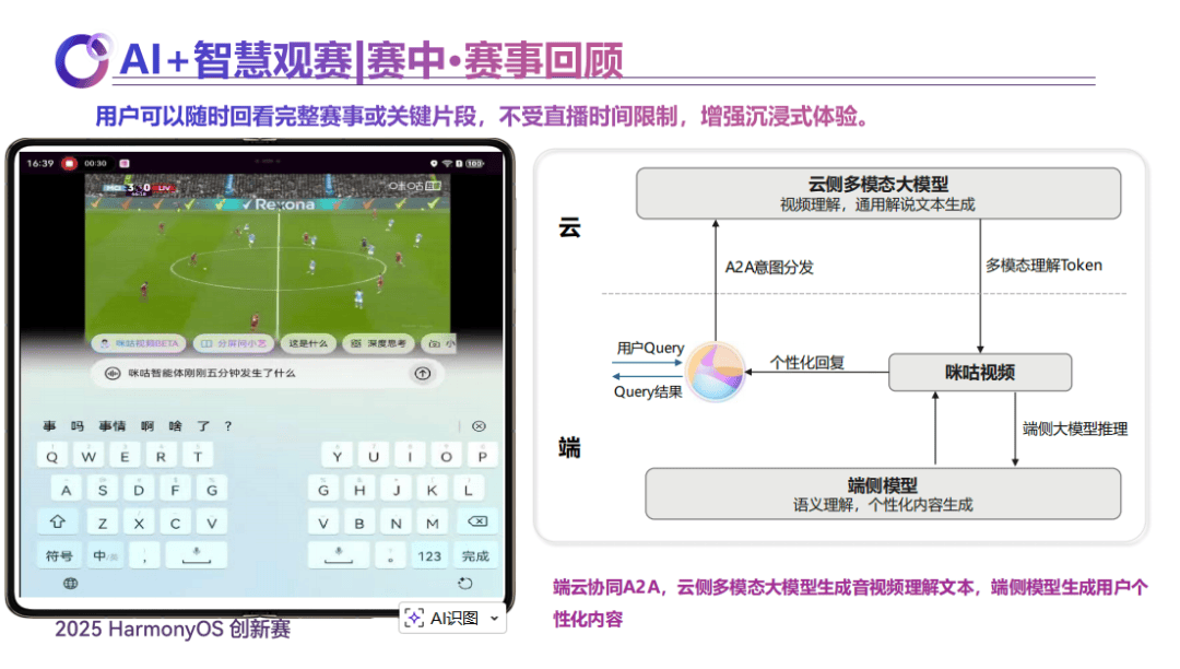 同时,利用端侧向量数据库与推理模型,将高频意图本地化处理,实现毫秒级响应;云端多模态大模型则负责复杂的视频理解与解说生成,通过A2A协议实现高效协同。