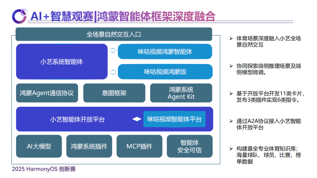 咪咕视频团队则展示了鸿蒙如何赋能超大型应用的深度智能化。其“AI+智慧观赛”方案,是鸿蒙 AI创新能力赋能大型应用的典型案例。其核心在于与鸿蒙智能体框架深度融合,重构体育内容消费链路,用户无需打开App,直接通过小艺智能体用自然语言提问,即可直达比赛预约、球星集锦、数据预测等深度服务。