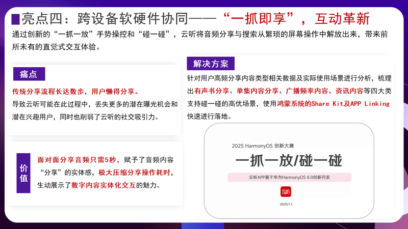 同时,借助分布式技术与AI手势识别,用户可在手机上做“抓取”手势,将正在收听的节目“投放”至附近的鸿蒙Pad或PC,实现了分享的直觉化。针对有声书、电台等高频内容,通过Share Kit实现设备间“碰一碰”分享,将传统多步流程精简为5秒完成,赋予音频内容实体化的交互魅力。