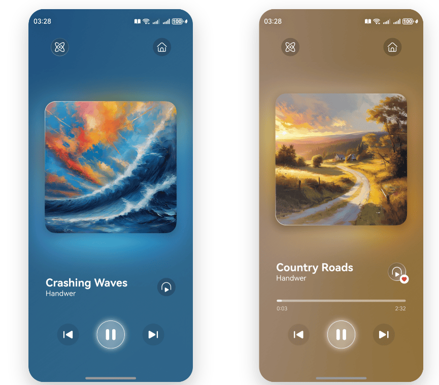 开发者介绍,他们大面积使用了鸿蒙 UI Design Kit 提供的统一设计控件,利用高斯模糊、渐变模糊和边缘渐隐接口,将光场特效铺满整个应用,实现了“每一触都是光影交融”的沉浸式体验。