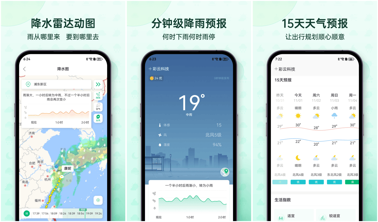 彩云天气是一款非常全面的天气数据 App, 可以观察实况天气, 分钟级降水预报, 比如未来 15 天天气预报。