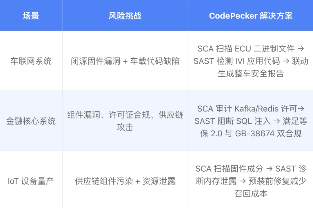 支持源码与二进制混合扫描,适配 APK、ECU、IoT 固件、Docker 镜像等非源码场景;