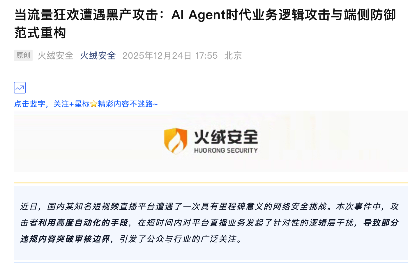 火绒安全官方发文,复盘快手平台直播遭黑灰产攻击事件。