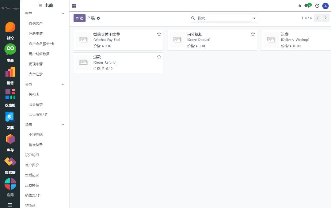 使用场景一:如果您想要搭建一套进销存(ERP)系统并实现微信商城及完整的电商管理后台,用OE商城系统(Odoo + oejia_weshop 系列模块)是个不错的选择,强大的生态,灵活的架构,可适应未来各种新的在线商业模式