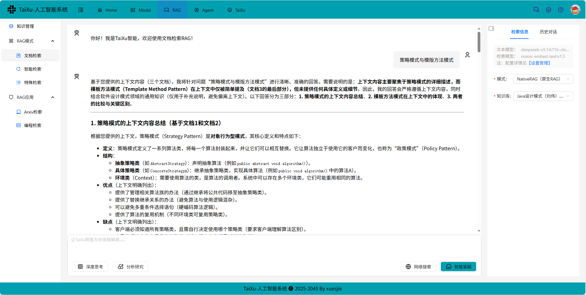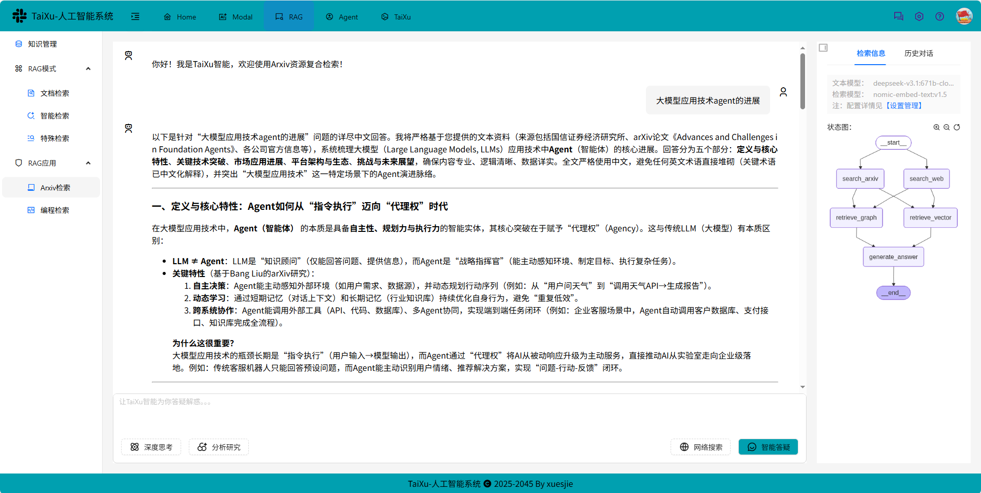 TaiXu-Admin 是 AI 技术集成的智能技术系统,后端用 Python 编写实现,前端用 React 开发交互页面,涉及到的大模型技术有 LLM 对话、RAG 和 Agent 等,大模型应用框架组件有 LangChain 和 LangGraph,支持 RAG 模式、Agent 模式、Prompt 工程、工具调用、记忆管理等功能,引入了对话式交互、知识检索增强生成(RAG)、多智能体协同(Agent)等 AI 能力。