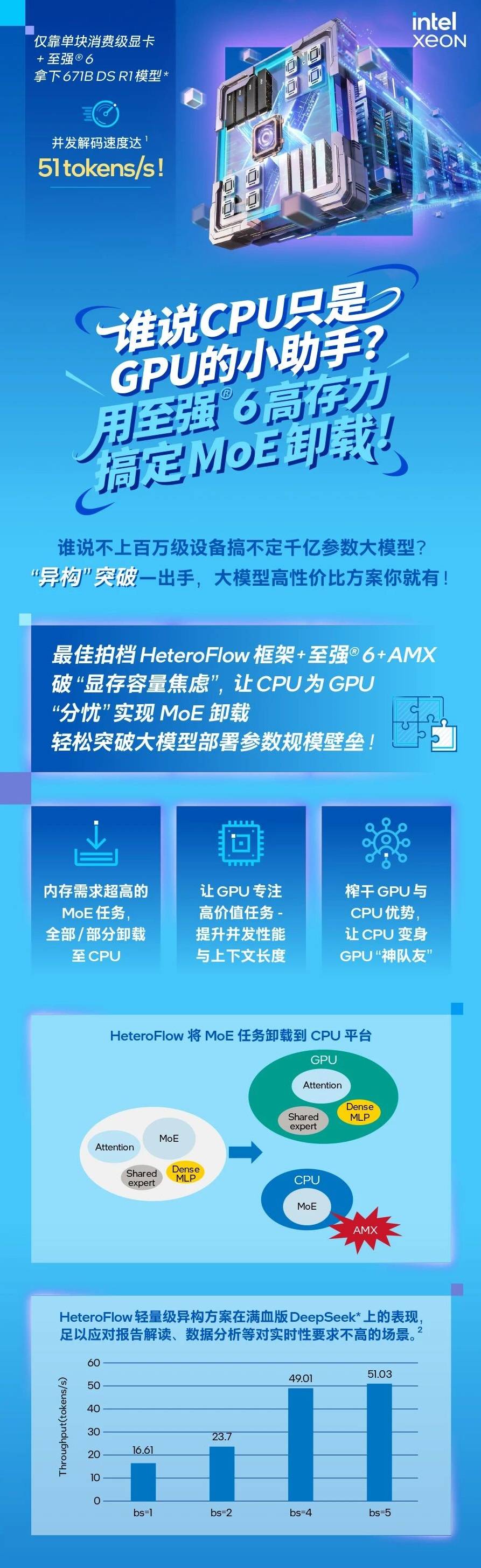 这就是英特尔开发的全新异构LLM服务方案流出的最新测试数据,这个方案基于HeteroFlow软件框架,搭配了至强6性能核CPU(配MRDIMM内存,开启AMX加速)作为硬件基座,它的目标就是缓解 “满血”大模型们面临的存力困局。