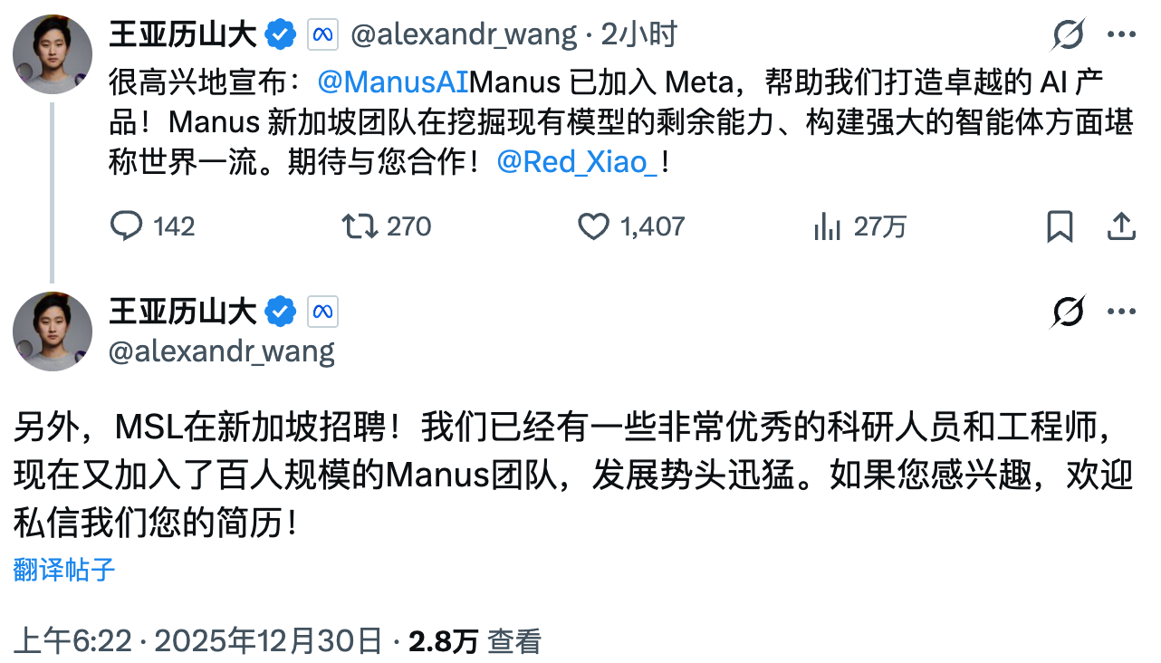 Meta 和 Manus 今日官宣:Manus 正式加入 Meta。
