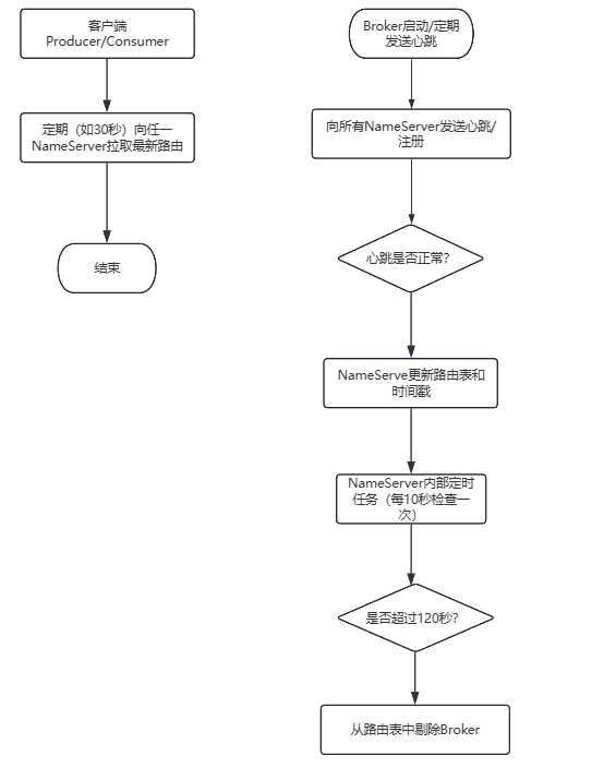 核心角色与设计哲学: NameServer的设计哲学是 "简单、无状态、最终一致" 。 每个NameServer节点独立运行,节点间互不通信, 这使其具备极强的水平扩展能力和极高的可用性。客户端会配置所有NameServer地址,并向其广播请求。