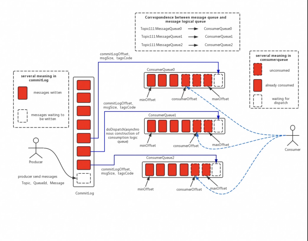 为了解决这个问题中,提高消费时候的速度,RocketMQ会启动后台的 dispatch 线程源源不断的将消息从 commitLog 取出消息在 CommitLog 中的物理偏移量,消息长度以及 Tag Hash 等信息作为单条消息的索引,分发到对应的消费队列,构成了对 CommitLog 的引用。