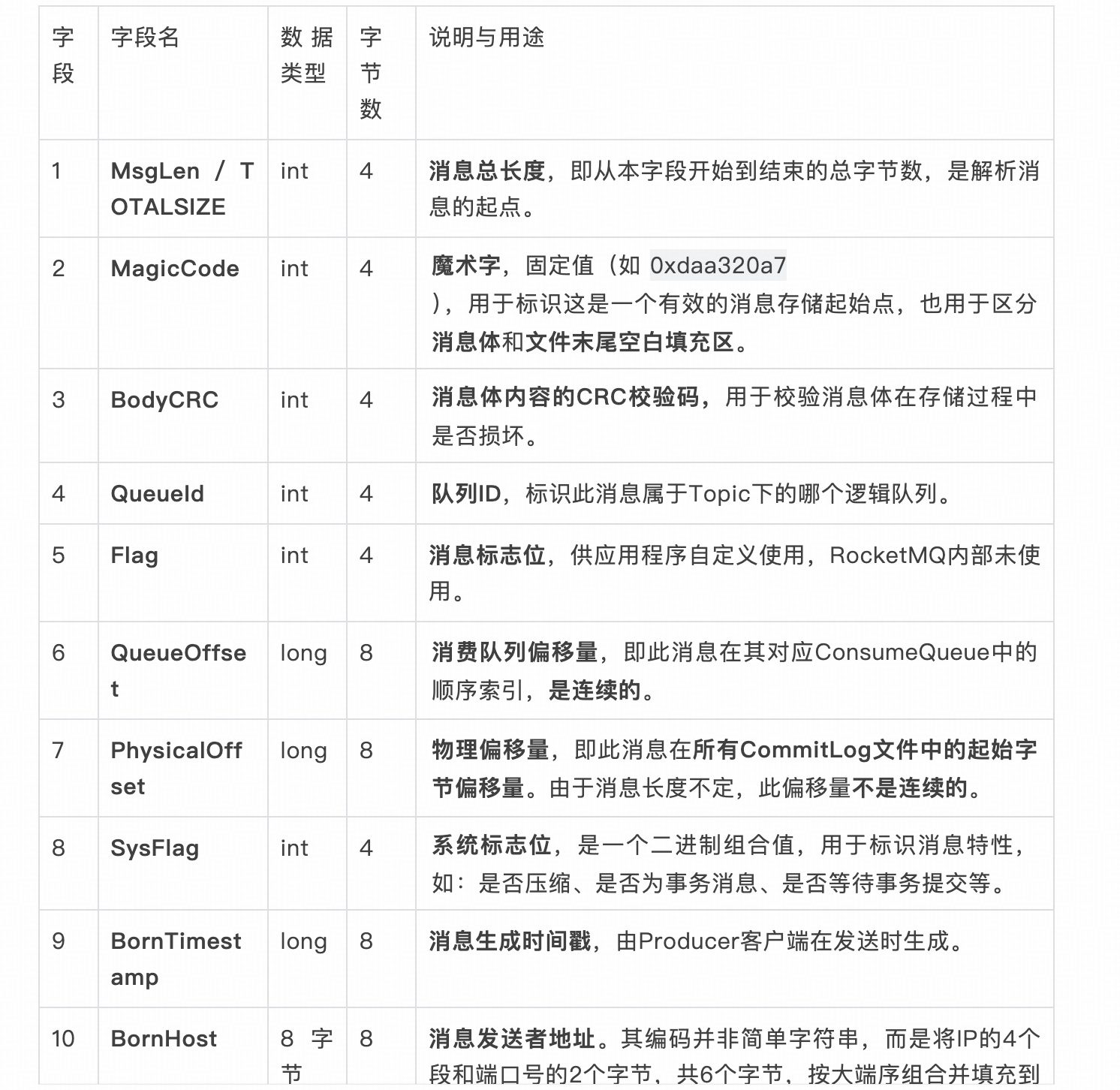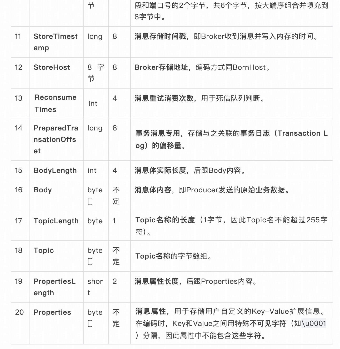 当我们消息发送到RocketMQ以后,消息在commitLog中,因为body大小是不固定的,所以每个消息的长度也是不固定的,其存储格式如下: