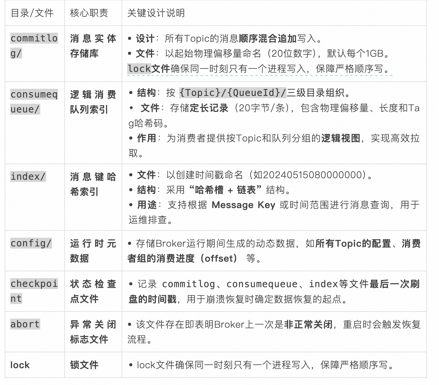 所有核心存储文件均位于Broker节点的 ${storePathRootDir}/store/ 目录下(默认路径为 ~/store/),其下各子目录职责分明:
