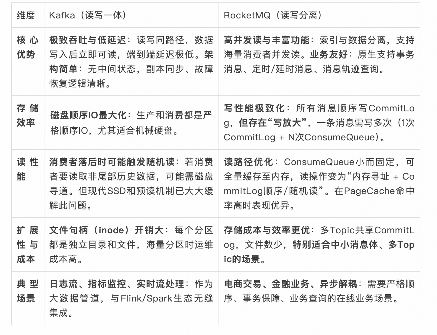- 以写定存储,以读优查询: 其存储架构是典型的写优化设计。所有消息顺序追加写入,保证了最高的写入性能。而针对消费和查询这两种主要的"读"场景,则分别通过异步构建索引数据结构(ConsumeQueue和IndexFile)来优化。