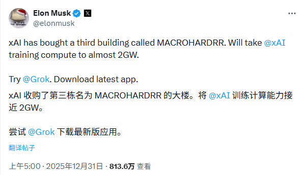 马斯克宣布公司已成功收购第三栋建筑,用于扩充其位于田纳西州孟菲斯市的基础设施。此次扩张的核心目标是将模型训练算力提升至近 20 亿瓦(2GW)。