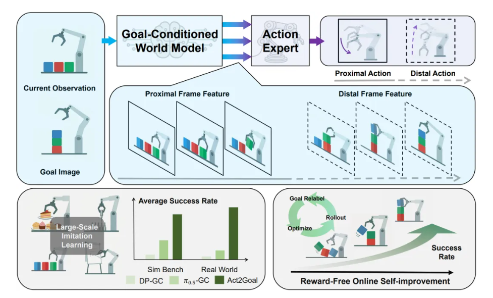 Act2Goal的核心在于将目标条件世界模型与动作生成策略统一于端到端框架,实现对任务演化过程的结构化理解。在每次操作前,系统不仅感知当前状态和目标状态,还通过世界模型预测从当前到目标的未来视觉轨迹,为动作专家提供连续、多尺度的规划依据。通过这种方式,目标不再是静态终点,而是一条可感知、可跟随的演化路径,从而显著提升长时序操作的稳定性与泛化能力。这一范式带来了两个关键优势: