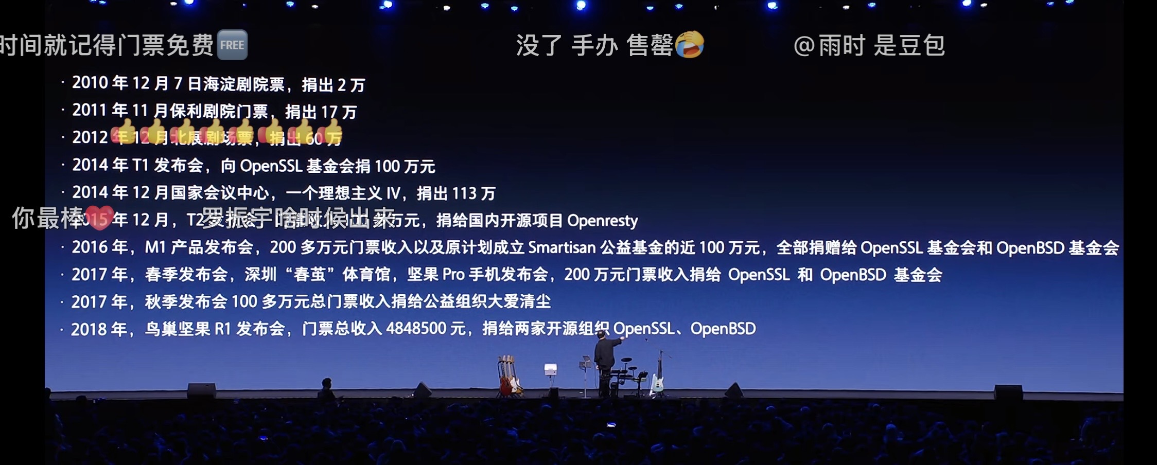 - 春季发布会(推出坚果Pro):门票收入约110万-200万元,全额捐赠给OpenSSL基金会和OpenBSD基金会,延续开源社区捐赠传统。