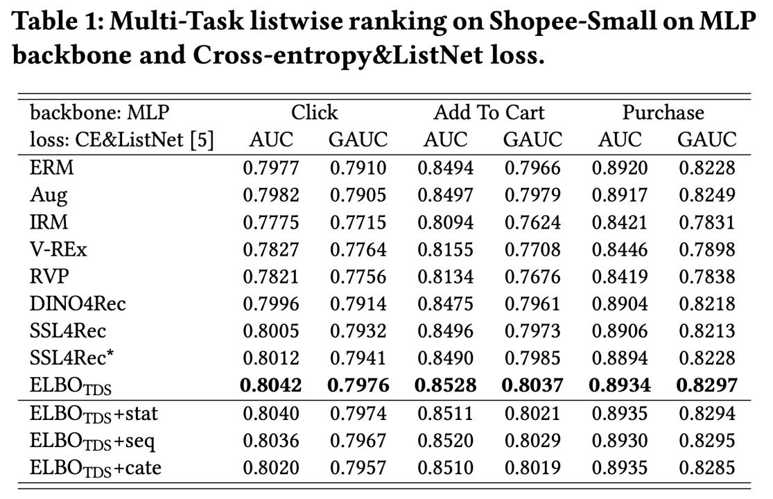 其次,ELBO_TDS在视频、电商两类模态的数据上均取得有效提升,也说明了TDS问题在各类推荐系统中广泛存在。