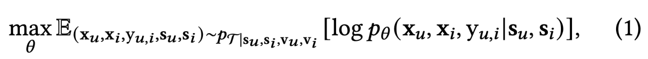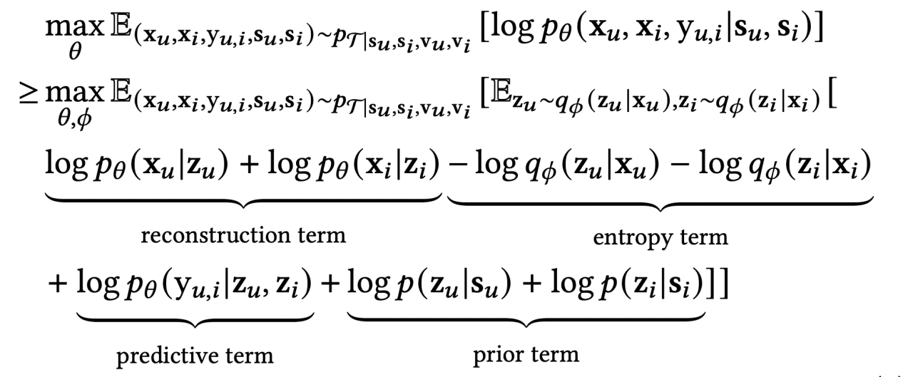 这个目标的含义是,从一个带有噪声V的数据分布上采样得到样本,但让模型试图仅仅学习given稳定因素S,X和Y的联合概率分布。上述目标不可直接优化,为了方便VAE形式的建模,引入隐变量Z,稍加推导,可以得到新的目标ELBO: