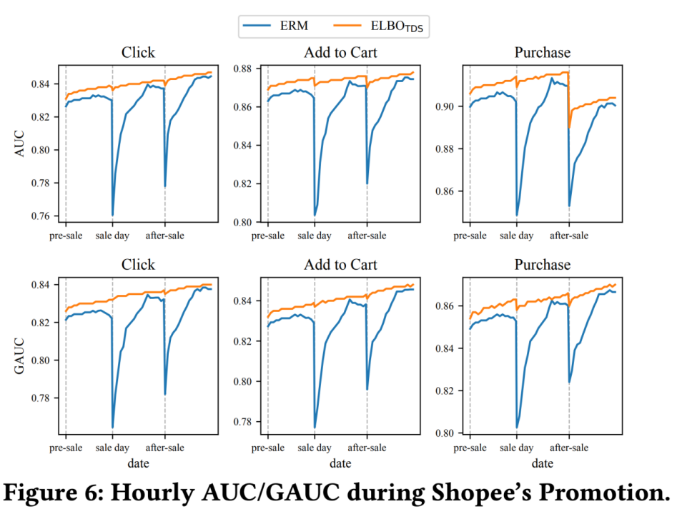 Baseline,即线上的ERM方法,在大促前后,即便切换到了小时级别更新,进行快速的分布adaption,依然在大促前夜、大促后夜的时间区间出现了auc断崖下跌,会对大促前几个小时的收入造成损失。而ELBO_TDS效果几乎无损。最终,在两周实验期间,ELBO_TDS取得了2.33%的GMV/user的收益推全。