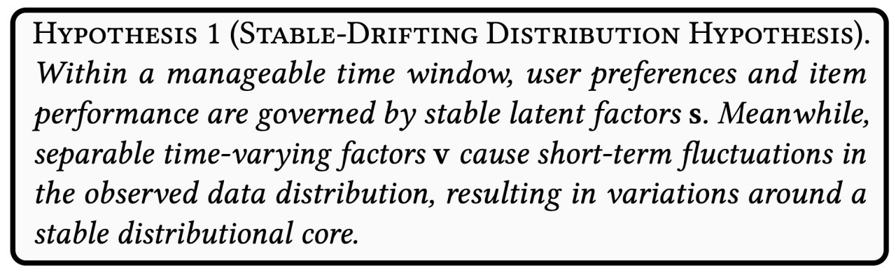 一般情况下,可以假定参与到推荐系统“协同过滤”过程的用户,是“理性”和“感性”掺杂的个体,但多数情况下理性占主导,尤其是电商场景,涉及到真实交易支付。一个商品的质量等本质属性不会突变,所以不会今天畅销、明天滞销、后天又畅销;同样,一个用户,也可以认为其文化背景、生活环境、年龄履历、经济状况,不会经常突变。因此,论文认为,这个稳定的均值代表参与到推荐系统的对象(用户和物品)的“稳定内核”,而横持续跳着的“方差”,则是由各种因素带来的“干扰”,例如社交媒体的流行趋势、热点讯息、用户不定期的访问习惯、广告促销、系统Bias和不确定性等等。