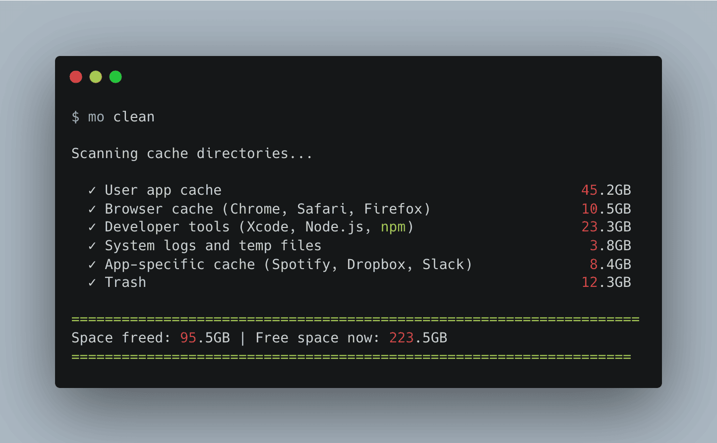 这是一款专为 macOS 设计的轻量级命令行清理工具,集深度清理、应用卸载、硬盘空间分析和实时状态监控于一体。它主要由 shell 编写,安装简单、零干扰(无广告/弹窗/常驻进程),支持白名单和试运行模式,进一步降低误删风险。