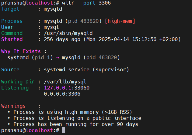 这是一个用 Go 编写的命令行诊断工具,用于快速定位和分析正在运行的进程。它通过端口、服务名或 PID 映射进程信息,生成通俗易懂的进程因果链,直观展示进程的来源、启动方式和持续运行的原因,帮助运维与开发者排查和定位异常进程。