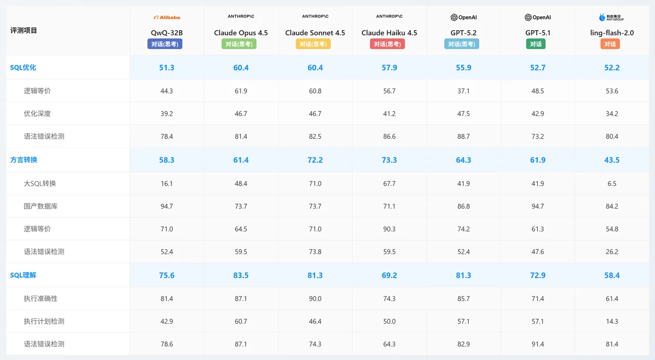 - 能力核心 : 在 国产数据库(94.7) 这一细分指标上取得了全场最高分(与 QwQ 并列)。虽然在优化深度和大 SQL 转换上稍弱,但在特定环境下的适应性极强。