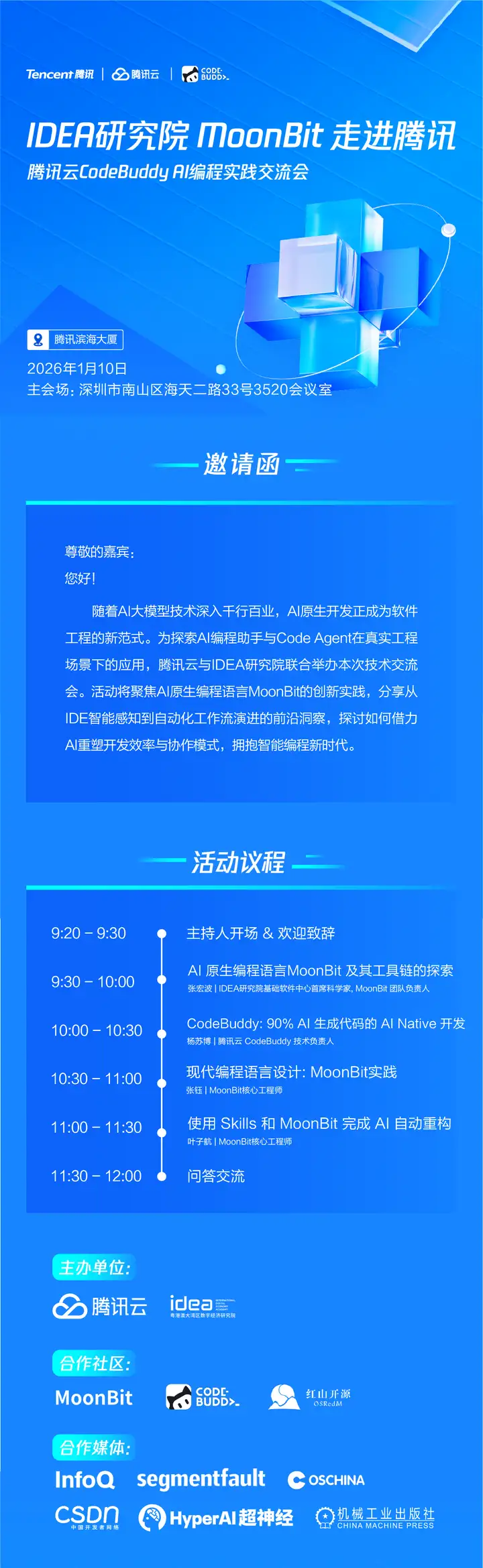 面向 AI 原生开发的新趋势,如何将 AI 编程真正落地到工程实践中?腾讯云 × IDEA 研究院 · MoonBit 将于 1 月 10 日(周六)上午在腾讯滨海大厦举办技术交流会,聚焦 AI 原生编程与 Code Agent 实战,分享一线团队的实践经验。