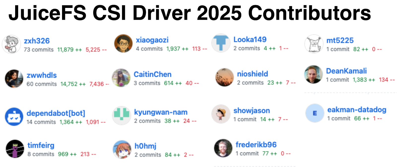2025 年,JuiceFS 社区版继续聚焦通用性,尤其在支持各类 AI 场景的需求。发布了 Python SDK、增强 Windows 客户端可用性,并加强了对云原生生态的支持;此外,元数据引擎 SQL 和 TiKV 也进行了针对性优化。今年,团队与社区成员一道推动了 JuiceFS 的持续迭代,共有 60 位贡献者参与,新增了 305 个 Issue,合并了 601 个 PR。
