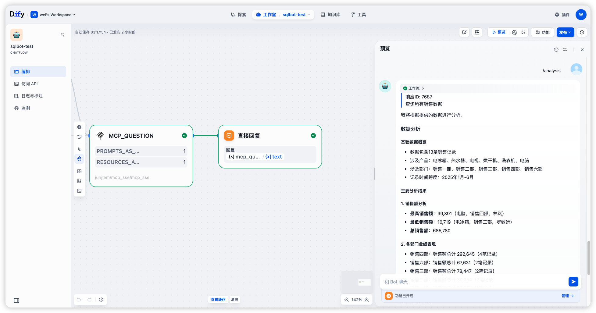 在SQLBot v1.5.0版本中,MCP服务新增支持数据分析和数据预测命令,这意味着通过MCP协议集成至SQLBot的应用(例如n8n、MaxKB、Dify、Coze等)也可以直接调用SQLBot强大的数据分析与预测能力,SQLBot的应用场景进一步扩大。此外,MCP新增的语言参数支持,为多语言环境下的集成应用提供了更好的本地化体验。与之配合的还有提示词模板和SQL生成逻辑的持续改进,这些优化举措共同提升了问答的准确性和智能化水平。