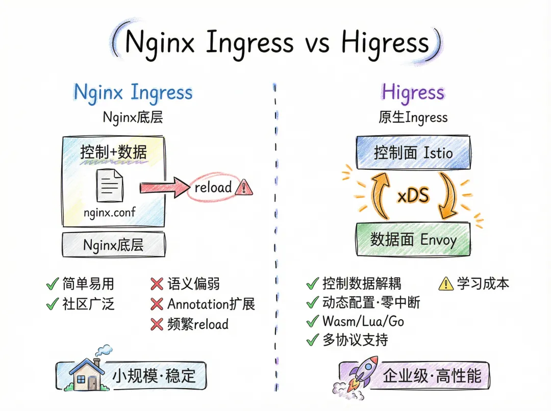 缺点是,相比 Nginx 广泛的社区基础,Higress 为代表的原生 Ingress API,部署和维护存在学习成本。