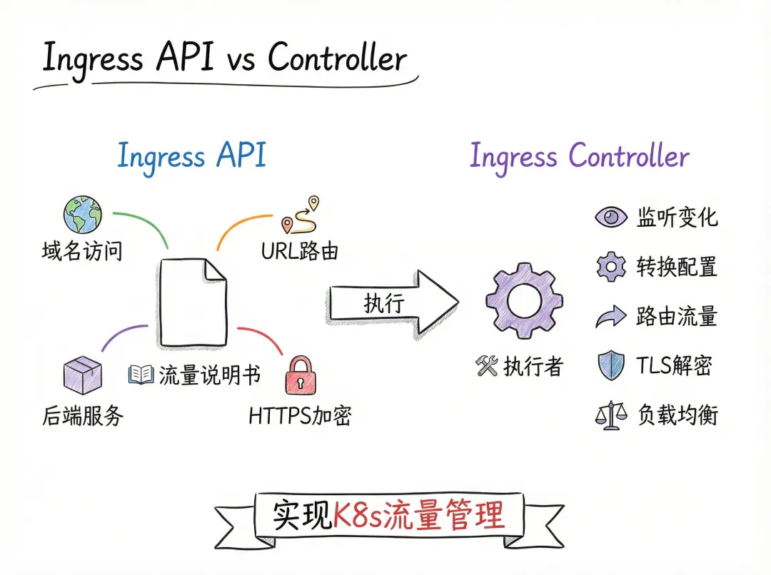 Ingress API 和 Ingress Controller 分别是 Kubernetes 流量管理的规范和执行器。