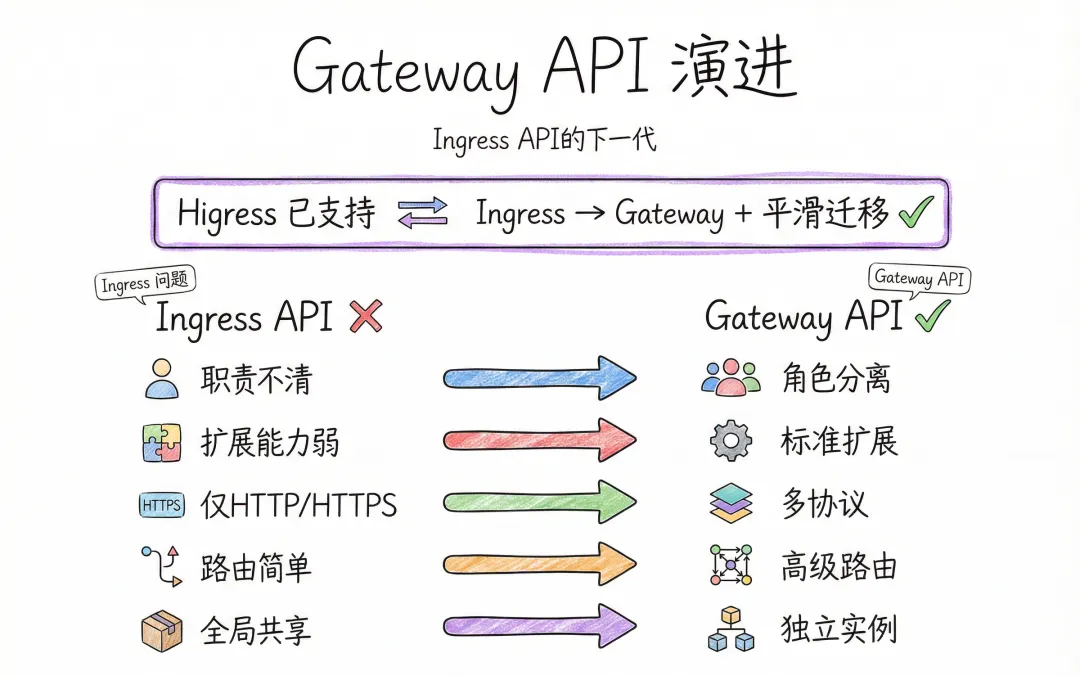 Gateway API 是 Ingress API 规范的超集和下一代。他的出现,是为了解决 Ingress API 自身无法搞定的问题。其中,Higress 已经支持 Gateway API 标准,用户可从 Ingress API 平滑迁移至 Gateway API。
