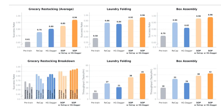实验结果表明,在各类测试场景下,结合SOP的后训练方法均得到了显著的性能提升。相比预训练模型,结合SOP的HG-Dagger方法在物品繁杂的商超场景中实现了33% 的综合性能提升。对于灵巧操作任务(叠衣服和纸盒装配),SOP 的引入不仅提升了任务的成功率,结合在线经验学习到的错误恢复能力还能明显提升策略操作的吞吐量。