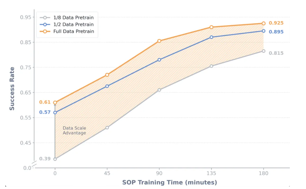 最后还探究了 SOP 和预训练数据之间的关系。把总量为160小时的多任务预训练数据分为了三组:20小时,80小时和160小时,分别训练一组初始模型后再进行 SOP。发现,预训练的规模决定了基座模型和后训练提升的轨迹。SOP 能为所有初始模型带来稳定的提升,且最终性能与VLA预训练质量正相关。