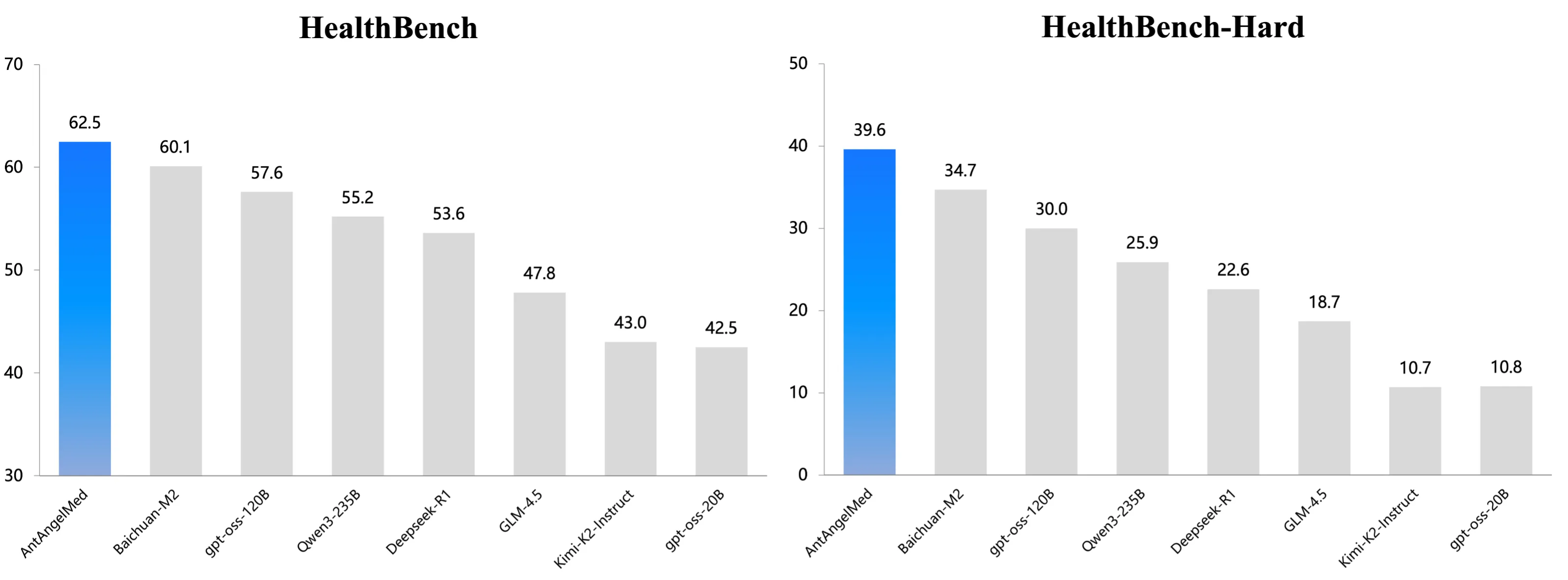 - 权威评测全球领先:在 OpenAI 的 HealthBench 评测上,AntAngelMed 超越所有开源模型及一系列顶尖闭源模型;在中国权威评测 MedAIBench 上,综合排名第一。