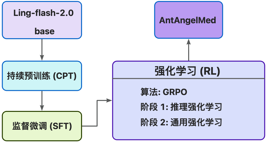 据介绍,AntAngelMed 采用了三阶段训练流程:
