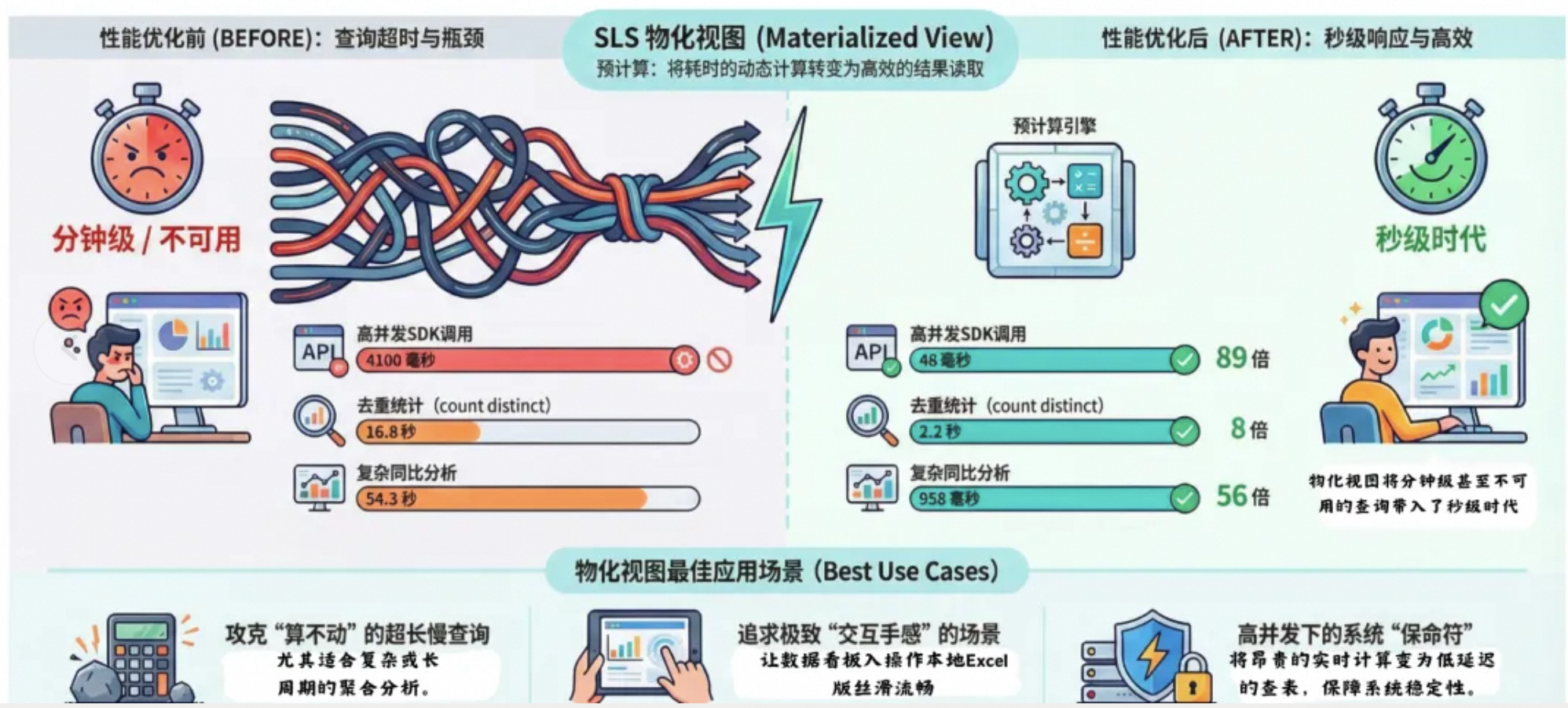 - 高并发轰炸下的"保命符":这是最容易被忽视的一点。很多时候单次查询虽然能忍,但一旦故障发生,几十号人同时刷新大盘,再加上自动化巡检脚本(SDK)几百个并发打过来,很容易触发服务端的资源瓶颈。物化视图的本质是把昂贵的"现场计算"变成了低延迟的"查表读取"。在关键时刻,这就是系统不崩盘的基石。